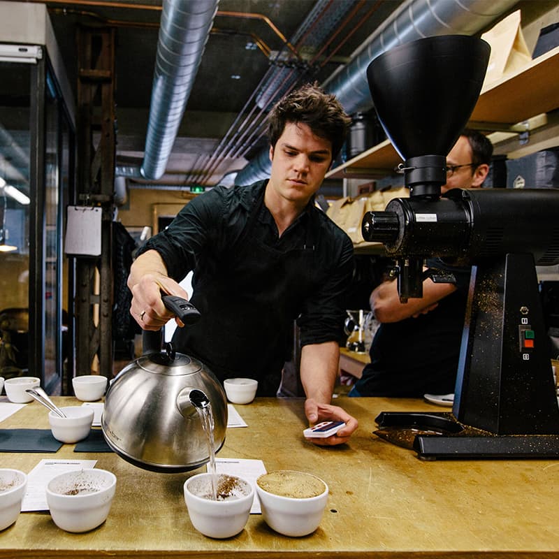 Versez 12 grammes par bol de 200 mL, avec une mouture assez grossière (entre le V60 et la cafetière à piston). Le café doit être fraîchement torréfié, on essaye de cupper les cafés entre 8 et 24h après la torréfaction avec une couleur spécifique liée au cupping (claire à moyenne afin d’avoir le minimum de marque de torréfaction sur la tasse et garder le maximum de fruit sans cacher les défauts).