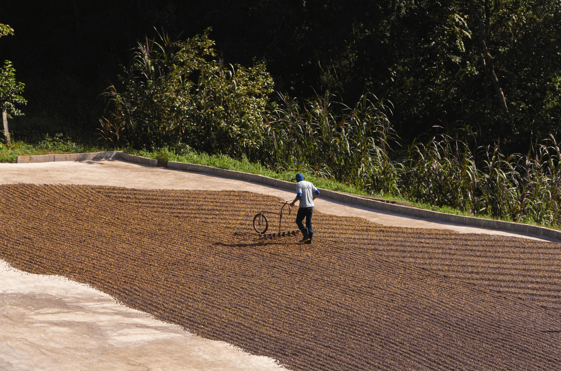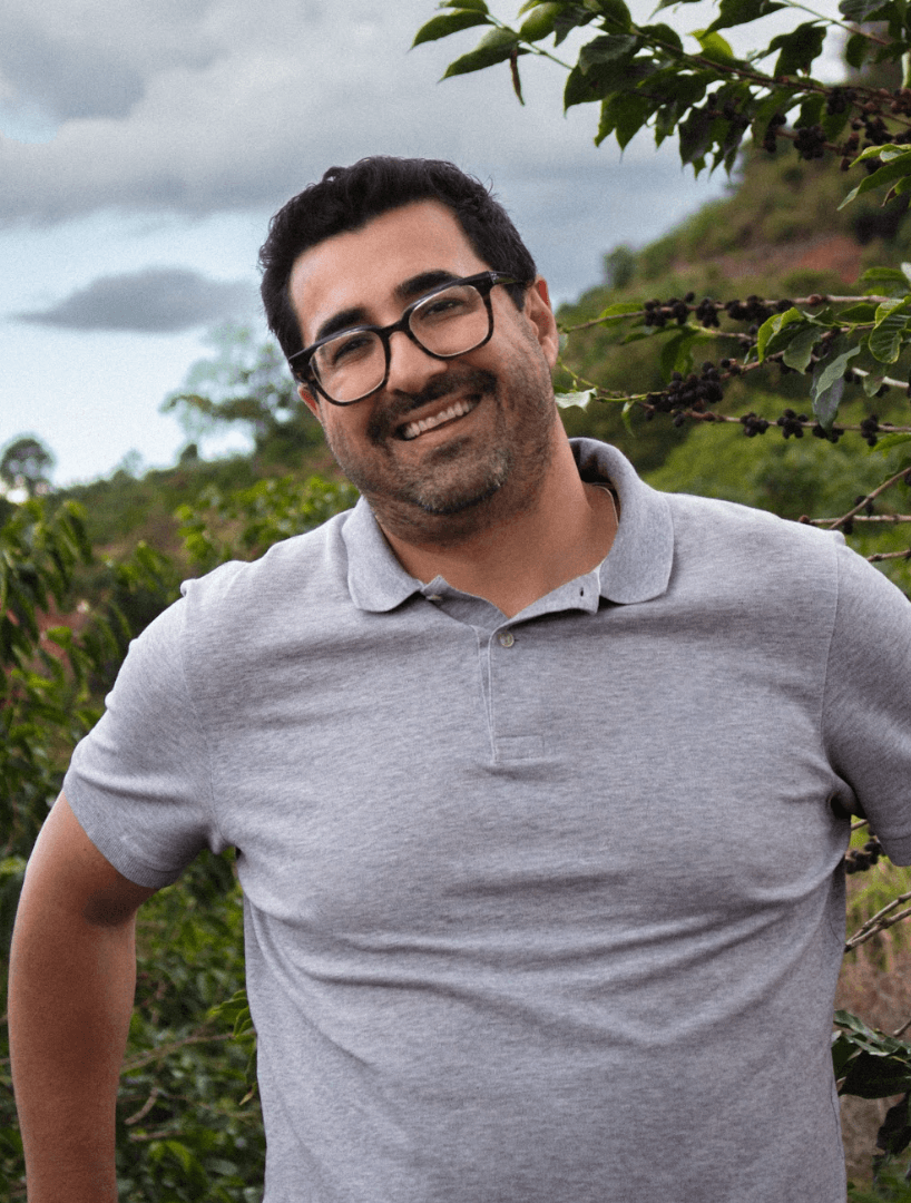 À Rancho São Benedito, on est accueillis avec douceur. Le producteur, Marcio, nous sert un café qu’il a torréfié lui-même sur place, à l’ancienne, avec une machine mécanique qu’on tourne à la main. En haut de la plantation, la vue est saisissante : collines couvertes de caféiers, terre ocre, lumière dorée du matin. Le terrain est si vallonné que le séchage du café se fait en haut, avant de tout redescendre en une seule fois pour éviter les allers-retours. En bas, une petite station de traitement post-récolte : trieuse, dépulpeuse, patio de séchage, séchoir... Chaque étape est maîtrisée, et les relations de confiance entre le producteur et les travailleurs sont palpables. On sent une vraie complicité, un respect mutuel, une proximité presque familiale. Baba est très proche d’eux, on voit qu’il revient souvent.
