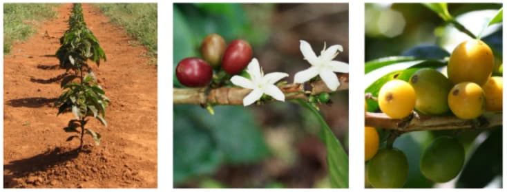 La première floraison survient 3 ans après la plantation, la première récolte l’année suivante, mais le caféier ne devient vraiment « rentable » qu’au bout de 5 à 6 ans.