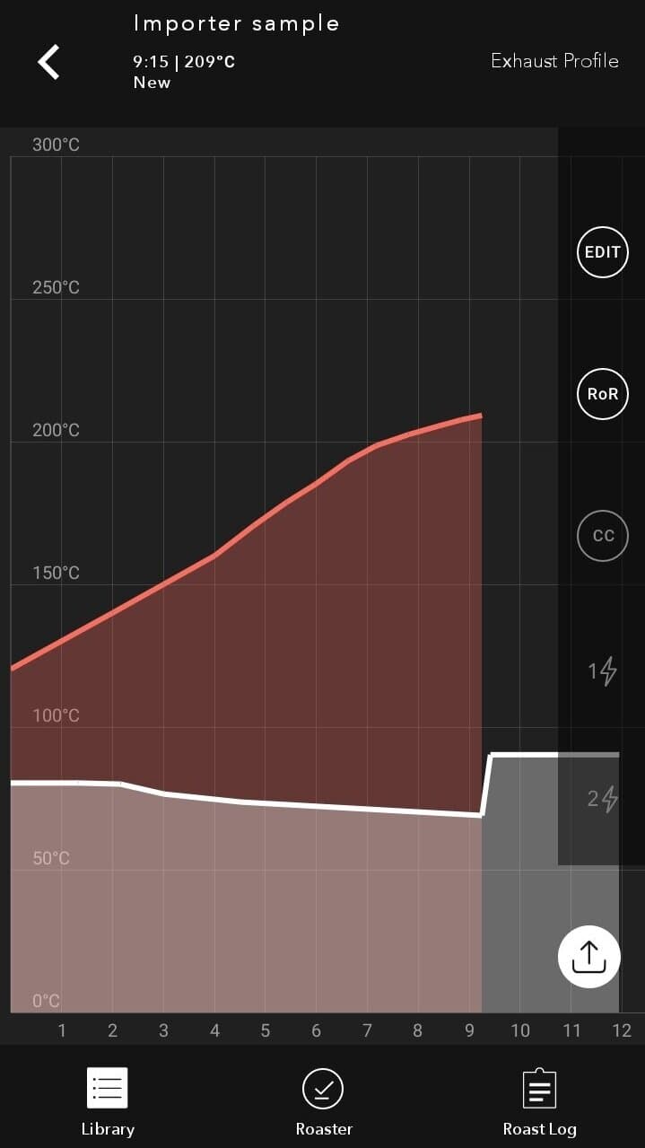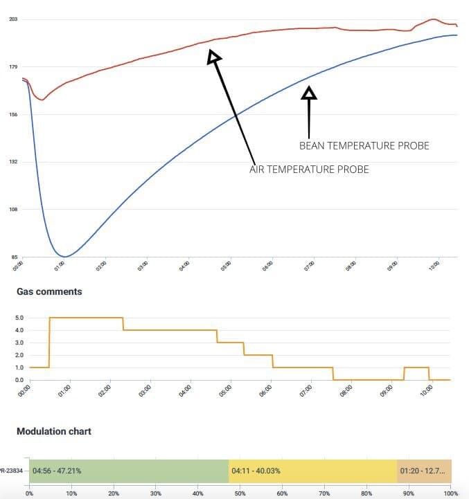 Nous appliquons un profil qui permet à la température des grains de café de trouver doucement un équilibre avec la température de l'air au fur et à mesure que le torréfaction progresse, jusqu’à atteindre la couleur finale visée. C'est une feuille de route sur la façon dont nous devons torréfier notre premier lot de production, nous permettant d'anticiper les changements de l'environnement de torréfaction.