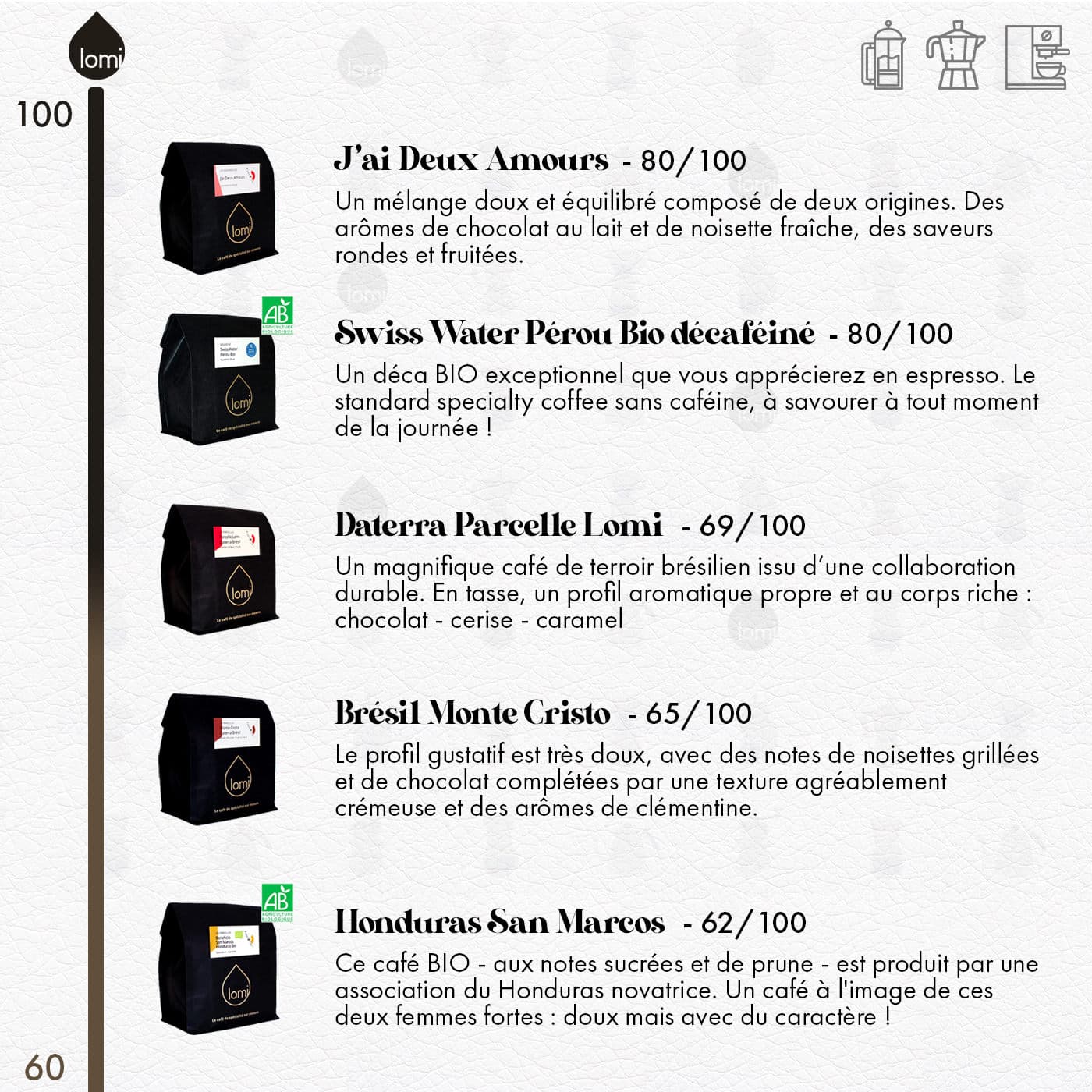 Nos trois gammes de cafés sont ainsi positionnées sur l'échelle Lomi de la manière suivante :