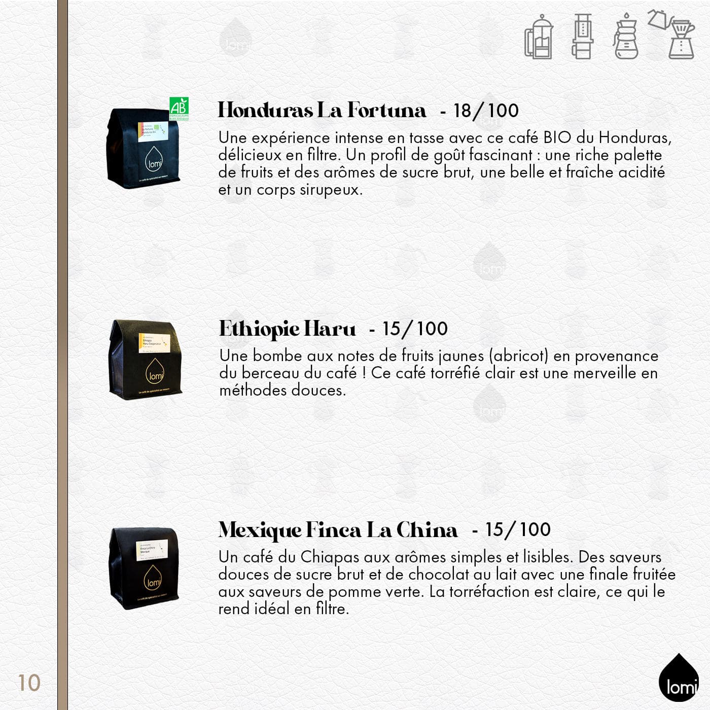 Les parcelles Lomi (single origin) : Le fruit de collaborations directes et à long terme avec des producteurs, l'expression d'un terroir récolte après récolte. Des origines soigneusement sélectionnées pour la qualité du travail agricole et le potentiel aromatique. Des cafés aux notes tantôt chocolatées, tantôt fruitées ou florales, à préparer en méthodes douces comme en espresso, et qui se suffisent à eux-mêmes !