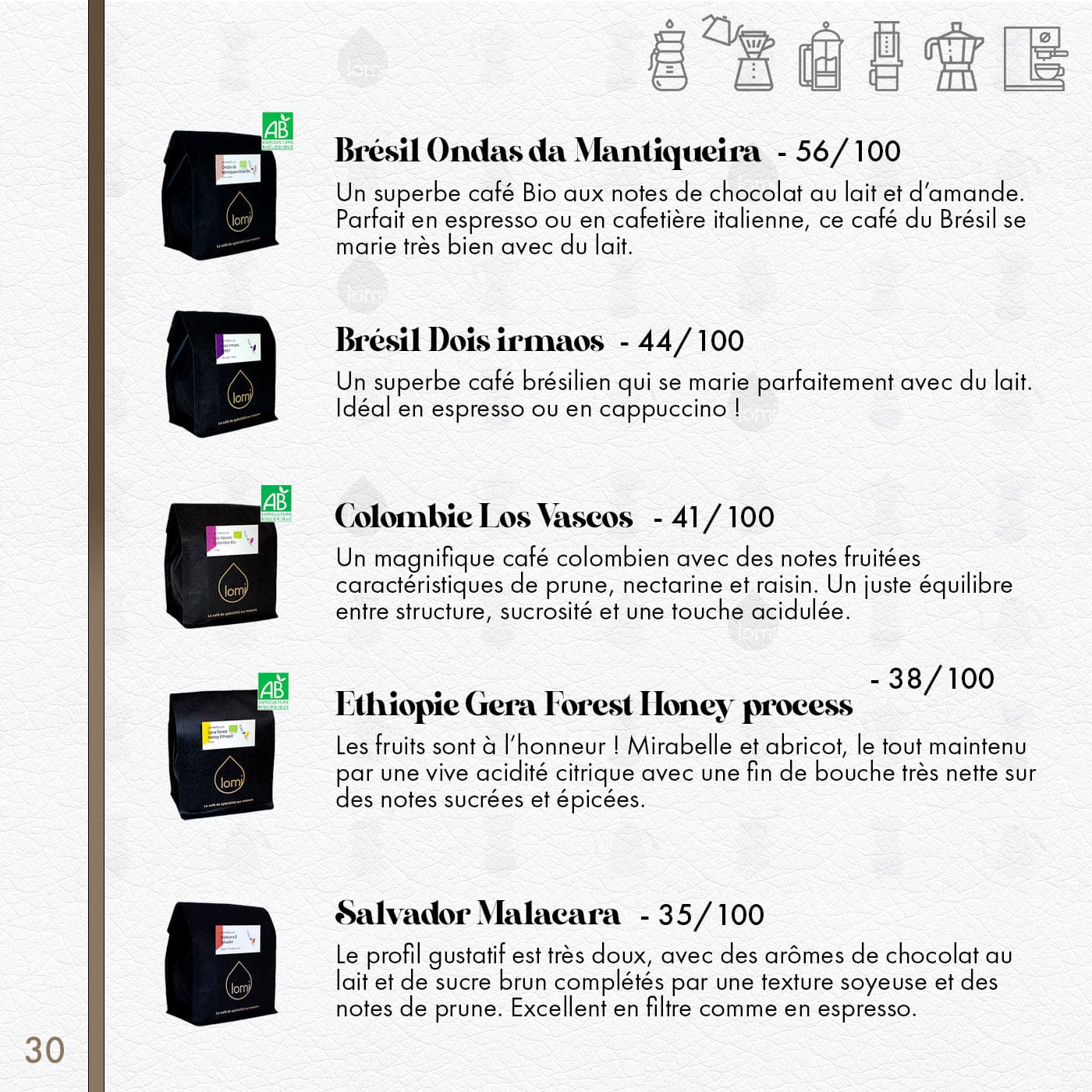 Notre assemblage signature "J'ai deux amours" se situe à 80 sur l'échelle Lomi, traduisant sa faible acidité et beaucoup de corps. Il en est de même pour notre décaféiné Bio du Pérou, destiné à l’espresso.