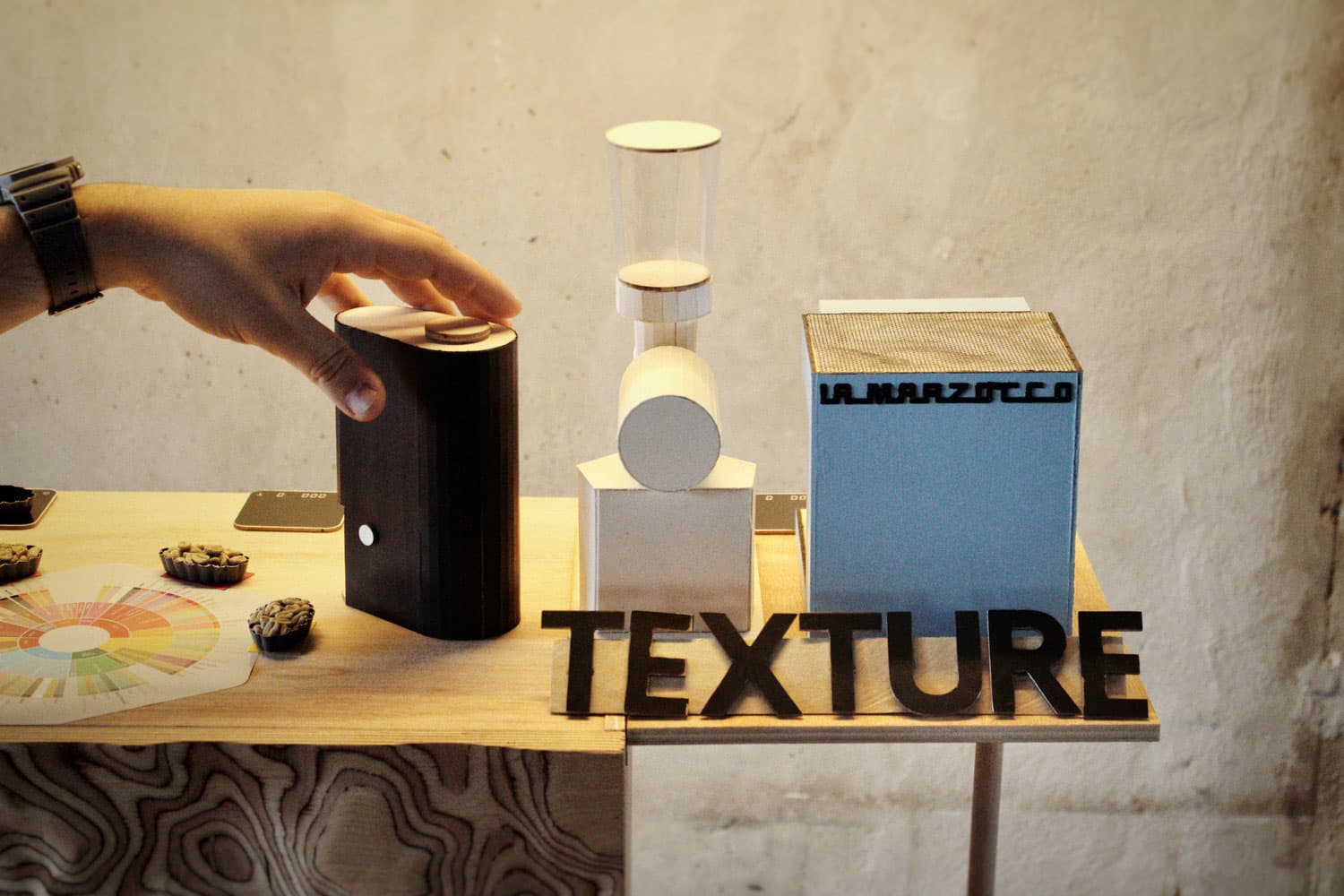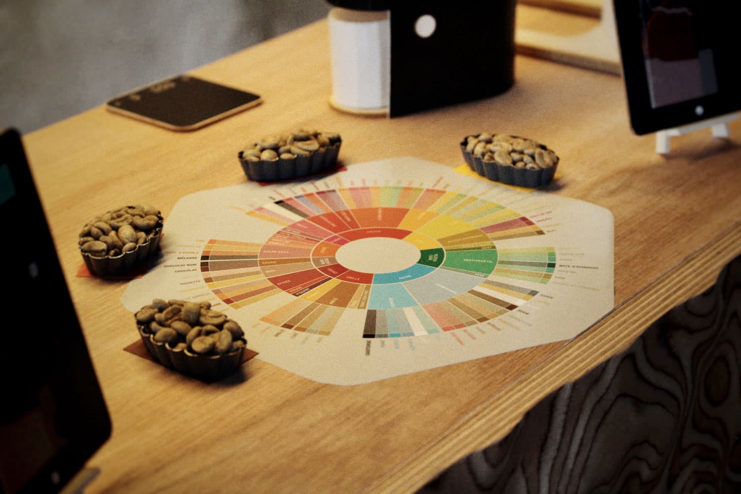 · Peux tu nous parler de ton projet TEXTURE ? Tout tourne autour de la texture, qui correspond au 5ème élément de notation de la SCA dans le café de spécialité. L’idée est de proposer le choix d’un assemblage sur mesure. Une fois l’association aromatique déterminée (représentée par la couleur), on décide d’une texture : juteuse, soyeuse ou sirupeuse, en changeant l’intensité de torréfaction, du plus clair au plus foncé.